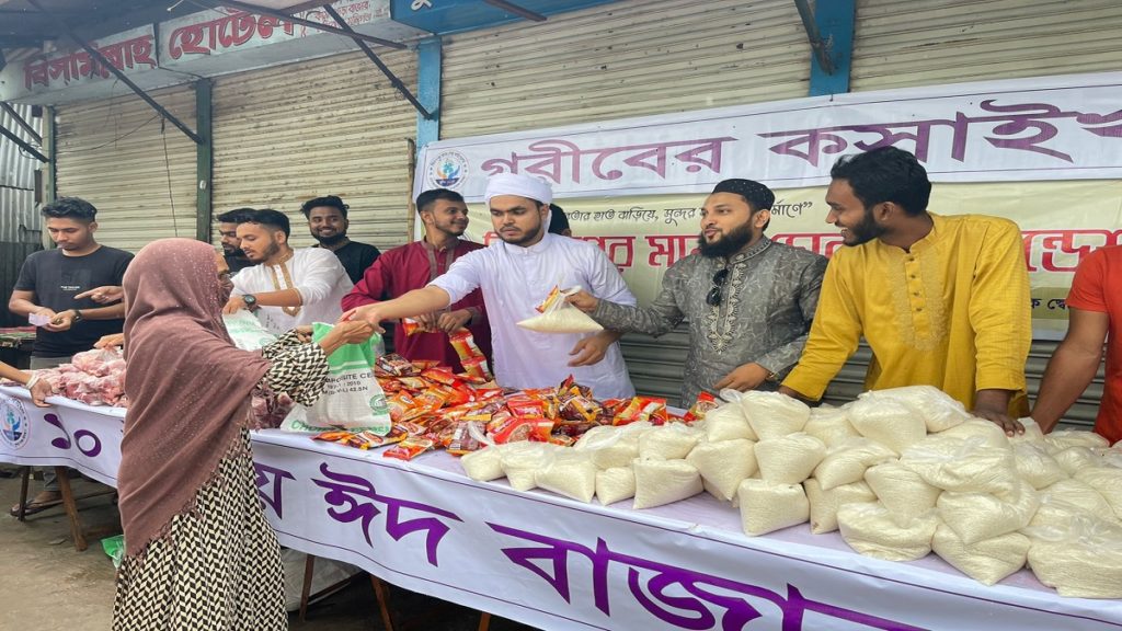 এক কেজি গরুর মাংস বিক্রি হচ্ছে ১০ টাকায়! সাথে বিনামূল্যে পাওয়া যাচ্ছে এক কেজি পোলাওয়ের চাল ও মাংসের মসলা। ঈদের দিন এমনই এক বাজারের দেখা মিলেছে মুন্সীগঞ্জের টঙ্গীবাড়ী উপজেলায়। নিম্ন আয়ের মানুষের সাথে ঈদের আনন্দকে ভাগ করে নিতে ‘গরীবের কসাইখানা’ নামের ঈদ বাজারের আয়োজনটি করেছে স্বেচ্ছাসেবী সংগঠন বিক্রমপুর মানব সেবা ফাউন্ডেশন।