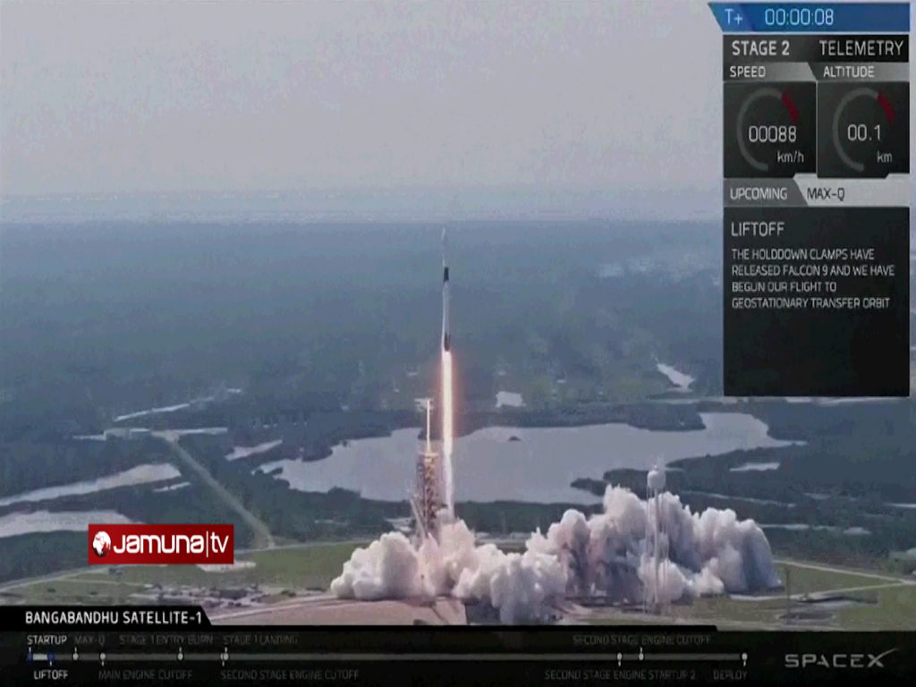 আনুষ্ঠানিকভাবে স্যাটেলাইট যুগে প্রবেশ করলো বাংলাদেশ। স্যাটেলাইট ‘বঙ্গবন্ধু-১’ বহনকারী রকেট যাত্রা শুরু করেছে মহাকাশের পথে। বাংলাদেশ সময় মধ্যরাত ২টা ১৪ মিনিটে যুক্তরাষ্ট্রের ফ্লোরিডার কেইপ কেনাভেরাল থেকে উৎক্ষেপণ করা হয় রকেটটি। এরপর রাত ২টা ৪৭ মিনিটে সফলভাবে কক্ষপথে পৌঁছায় বলে জানিয়েছে স্পেসএক্স।