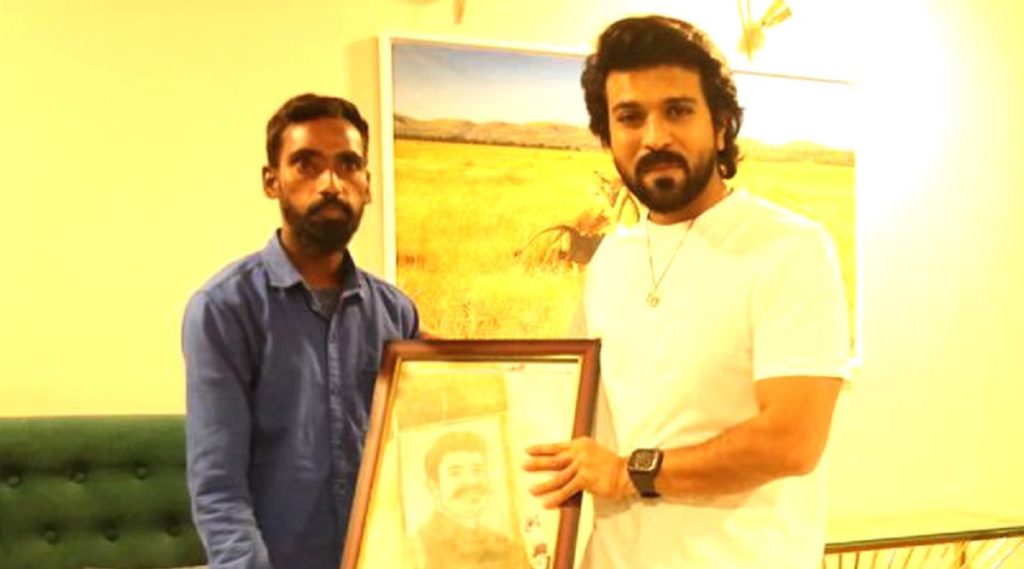 ছবিতে দেখা যাচ্ছে, অনুরাগীকে নিজের পাশে বসিয়ে তার শিল্পকর্ম সম্পর্কে বিস্তারিত শুনছেন রামচরণ। তার সঙ্গে ক্যামেরার সামনে পোজও দিয়েছেন। রামচরণকে দুই বস্তা চালও উপহার হিসেবে দিয়েছেন জয়রাজ।