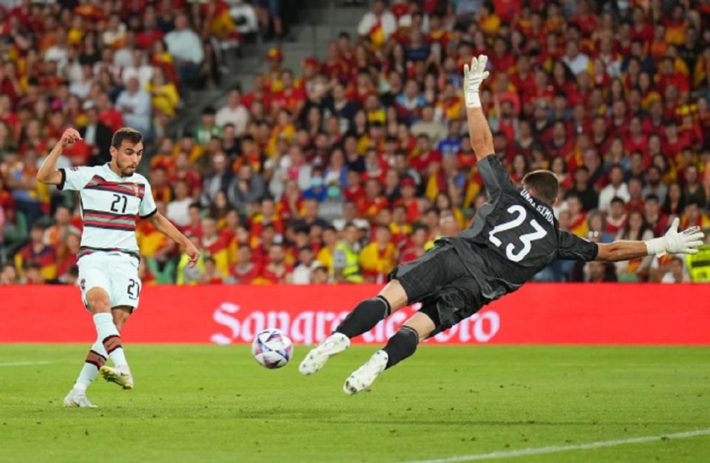 ‘এ’ লিগের দুই নম্বর গ্রুপ ম্যাচে একাদশে ৬ পরিবর্তন নিয়ে মাঠে নামে স্পেন। আর পর্তুগালের একাদশে তিন পরিবর্তন। ঘরের মাঠে শুরুতেই আক্রমণাত্মক ছিল স্পেন। তবে ১৮ মিনিটে রাফায়েল লেয়াওয়ের সহজ সুযোগ মিসে লিড নেয়া হয়নি পর্তুগালের। পাল্টা আক্রমণে মিনিট সাতেকের মাথায় আলভারো মোরাতার গোলে লিড নেয় স্পেন। ২৯ মিনিটে ব্যর্থ হয় কার্লোস সলেরের পরপর দু’টি প্রচেষ্টা।