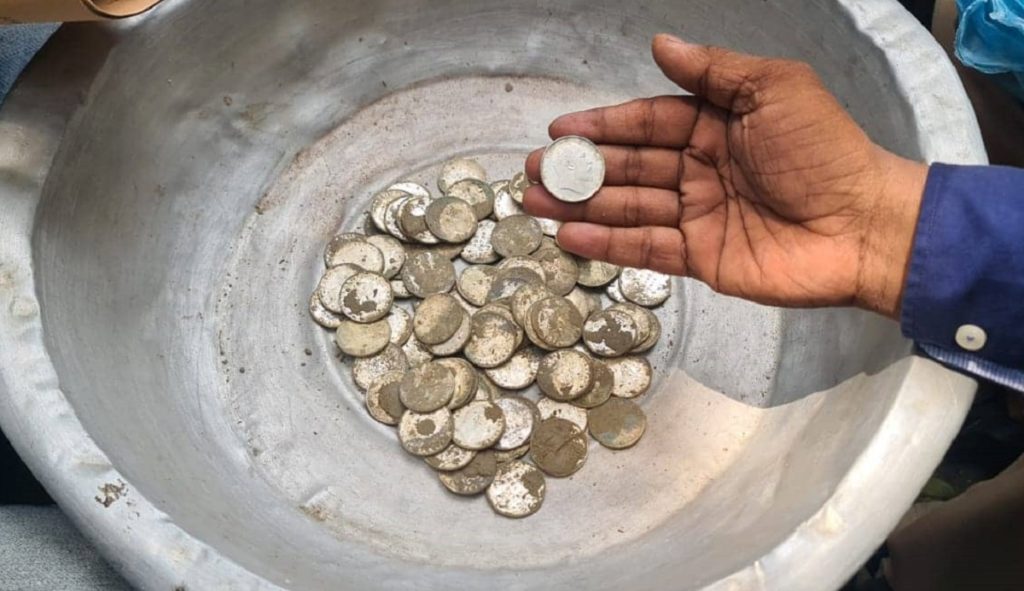নারায়ণগঞ্জের রূপগঞ্জে মাটির নিচ থেকে মিলেছে ৯৮টি রৌপ্য মুদ্রা। ওই এলাকায় একটি নির্মাণাধীন বাড়ির কাজে মাটি খুঁড়তে গিয়েই একটি ছোট মাটির পাত্র থেকে ব্রিটিশ আমলের ৯৮টি রৌপ্য মুদ্রা পান শ্রমিকেরা। পরে বাড়ির মালিক ও এলাকাবাসী পুলিশকে খবর দিলে ওই মুদ্রাগুলো উদ্ধার করা হয়।