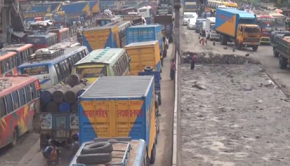 ঢাকা-চট্টগ্রাম মহাসড়কের নারায়ণগঞ্জের সাইনবোর্ড থেকে কুমিল্লার দাউদকান্দি পর্যন্ত প্রায় ৩০ কিলোমিটার অংশে থেমে থেমে চলছে গাড়ি।