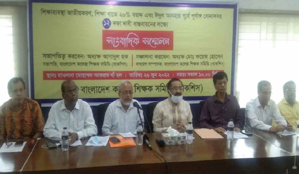 শিক্ষাব্যবস্থা জাতীয়করণ এবং শিক্ষাখাতে বরাদ্দ বৃদ্ধিসহ ১২ দফা দাবি বাস্তবায়নের জন্য সংবাদ সম্মেলন করেছে বাংলাদেশ কলেজ শিক্ষক সমিতি, বাকশিস। দাবি মেনে না নেওয়া হলে কঠোর আন্দোলন কর্মসূচির হুঁশিয়ারিও দিয়েছেন কলেজশিক্ষকরা।