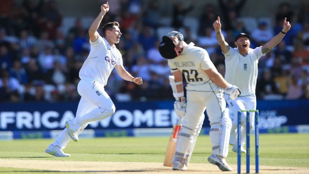 আগের দিনের ৬ উইকেটে ২৬৪ রান নিয়ে দিন শুরু করে ইংল্যান্ডের দুই অপরাজিত ব্যাটার, সেঞ্চুরিয়ান বেয়ারস্টো ও ওভারটন। স্কোর বোর্ডে ৩২ রান যোগ করার পর ৯৭ রান করা ওভারটনকে বোল্ট ফেরালে ভাঙে পঞ্চম উইকেটে ২৪১ রানের জুটি। এরপর ব্রড ৪২ আর বেয়ারস্টো ১৬২ রানে সাজঘরে ফিরলে মূলত ৩৬০ রানে অলআউট হয় ইংল্যান্ড।