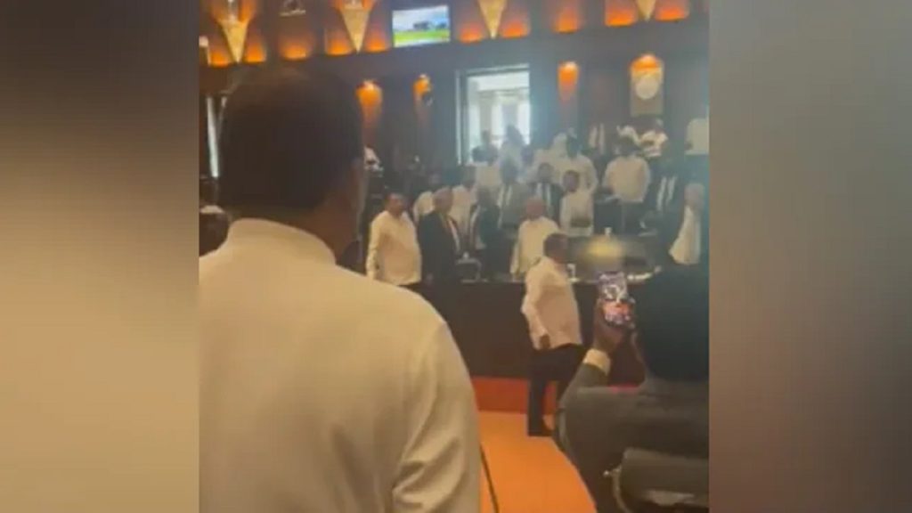 ঘটনাটির একটি ভিডিও ক্লিপ সামাজিক যোগযোগমাধ্যম টুইটারে শেয়ার করেছেন সংসদ সদস্য হার্শা ডি সিলভা। যাতে দেখা যায়, কিছু সংসদ সদস্য প্ল্যাকার্ড হাতে নিয়েছেন এবং ‘গোটা গো হোম’ স্লোগান দিচ্ছেন। এ সময় গোতাবায়া তার সহযোগীদের সাথে কথা বলেন এবং উঠে ঘর ছেড়ে চলে যান।