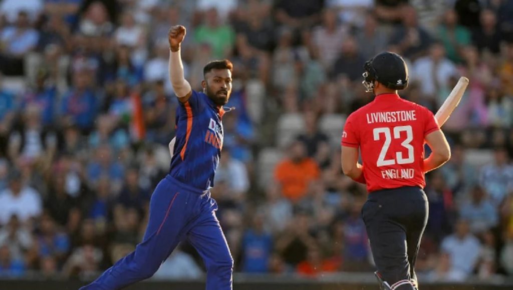 বিশাল এই রানের জবাবে ব্যাট করতে নেমে শুরু থেকেই ব্যাটিং বিপর্যয়ে পড়ে ইংল্যান্ড। একপর্যায়ে ৩৩ রানেই ৪ উইকেট হারিয়ে বসে। পরে মঈন আলি ও হ্যারি ব্রুকের ৩৬ বলে ৬১ রানের পার্টনারশিপে ঘুরে দাঁড়ানোর ইঙ্গিত দিলেও জয়ের জন্য তা পর্যাপ্ত ছিল না। ফলে ১৪৮ রানে থামে ইংল্যান্ডের ইনিংস। সর্বোচ্চ ৩৬ রান করেন মঈন আলি। আর হার্দিক পান্ডিয়া তুলে নেন ৪টি উইকেট।