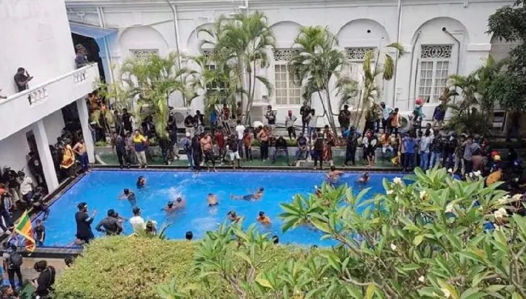 সুইমিংপুলের চারপাশে পতাকা হাতে জড়ো হয়েছেন হাজার হাজার উত্তেজিত আন্দোলনকারী। এ সময় একদলকে রান্নাঘরে রান্নাও করতে দেখা গেছে। আরেকদল বড় একটি টেবিলের চারপাশে অবস্থান নিয়েছে।