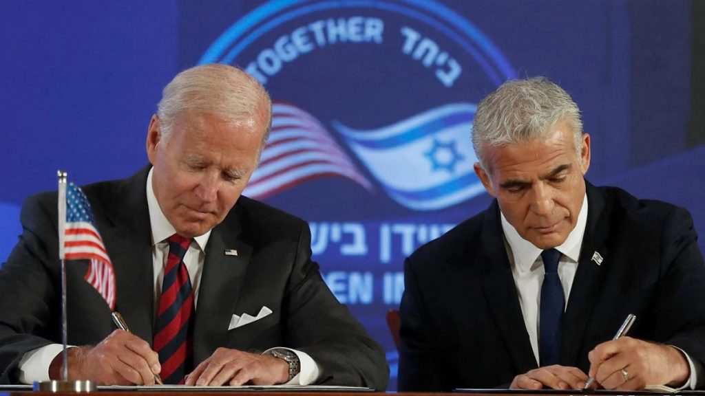 জো বাইডেনের মধ্যপ্রাচ্য সফরে ইরান বিরোধী কঠোর কোনো সিদ্ধান্ত আসবে এটা স্পষ্ট ছিল আগেই। সফরের দ্বিতীয় দিনে যুক্তরাষ্ট্র-ইসরায়েল চুক্তি যেন ইরানের বিরুদ্ধে রীতিমতো যুদ্ধ ঘোষণা। চুক্তি অনুযায়ী ইরানের পরমাণু কর্মসূচি ঠেকাতে একজোট হয়ে লড়বেন মার্কিন প্রেসিডেন্ট জো বাইডেন এবং ইসরায়েলি প্রধানমন্ত্রী ইয়ার লাপিদ।