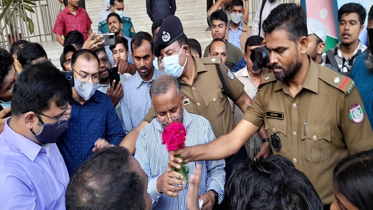 রেলের মহাপরিচালক ধীরেন্দ্র নাথ মজুমদারকে ৬ দফা দাবি সংবলিত স্মারকলিপি ও গোলাপ ফুল দেন মহিউদ্দিন রনি।