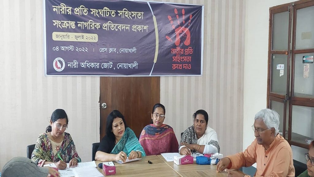 ‘নারীর প্রতি সহিংসতা রুখে দাও’ এ শ্লোগানে নোয়াখালীতে সাম্প্রতিক নারীর প্রতি সংঘটিত সহিংসতা ও নির্যাতন সংক্রান্ত নাগরিক প্রতিবেদন প্রকাশ করেছে জেলা নারী অধিকার জোট নোয়াখালী।