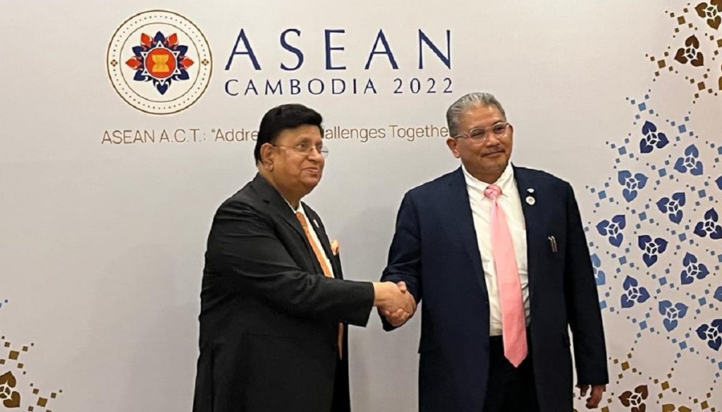 ২৯তম আসিয়ান আঞ্চলিক ফোরামে মন্ত্রী পর্যায়ের বৈঠকে অংশগ্রহণের জন্য ৩ দিনের সফরে বর্তমানে কম্বোডিয়া আছেন বাংলাদেশের পররাষ্টমন্ত্রী ড. এ কে আবদুল মোমেন। সফরে গিয়ে ব্রুনাইয়ের বৈদেশিক সম্পর্ক বিষয়ক বিষয়ক মন্ত্রী দাতো ইউসুফের সাথে সৌজন্য সাক্ষাৎ করেছেন পররাষ্ট্রমন্ত্রী। বৃহস্পতিবার (৪ আগস্ট) কম্বোডিয়ার রাজধানী নমপেনে এই বৈঠক অনুষ্ঠিত হয়।