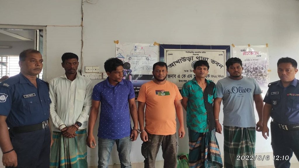 আটককৃতরা হলেন, উপজেলার ধরখার ইউনিয়নের ঝিকুটিয়া গ্রামের জুনাইদ ভূইয়া (৩০), মনিয়ন্দ গ্রামের সাধন সূত্রধর (৪০), উত্তর ইউনিয়নের রামধন নগর গ্রামের আলমগীর হোসেন (৩০), একই এলাকার আমোদাবাদ গ্রামের জামাল (৪০), আজমপুর গ্রামের আলাল মিয়া (৪৫) এবং দক্ষিণ ইউনিয়নের আব্দুল্লাহপুর গ্রামের ওয়ারেন্টভুক্ত পলাতক আসামি সোহরাব মিয়া (৩৫)।