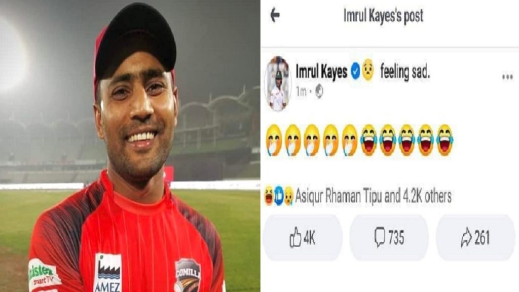 জিম্বাবুয়ের বিপক্ষে সিরিজ হারে বিষণ্ণ বোধ করছেন ইমরুল কায়েস; বিতর্কিত পোস্টটিতে এমনই দাবি করা হয়। কারণ, সেখানে যুক্ত ছিল, ইমরুল কায়েস ফিলিং স্যাড। তবে এটুকুর জন্য পোস্টটিকে বিতর্কিত বলা হচ্ছে না। বিতর্ক সৃষ্টি করেছে পোস্টের কিছু ইমোটিকন। মুখ চেপে হাসার পাঁচটি ইমোটিকনের পর দেয়া হয়েছিল অট্টহাসির পাঁচটি প্রতীকী অভিব্যক্তি। মিনিটখানেকের মধ্যেই কয়েক হাজার রিয়্যাকশনে ভরে যায় পোস্টটি। দ্রুতই তা সরিয়েও নেয়া হয়।