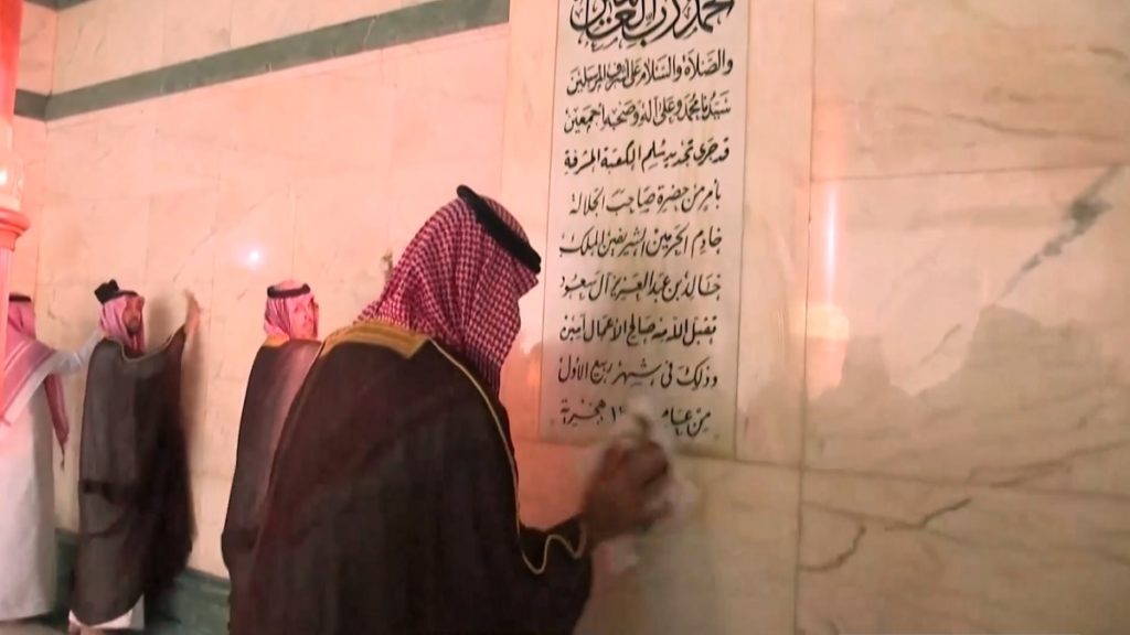 টুইটারে শেয়ার করা এক ভিডিওতে যুবরাজ সালমানকে এক টুকরো কাপড় হাতে কাবার ভেতরের দেয়াল মুছতে দেখা যায়। এ সময় যুবরাজের সাথে ছিলেন, ক্রিড়ামন্ত্রী যুবরাজ আবদুল্লাহ আজিজ বিন তুর্কি।
