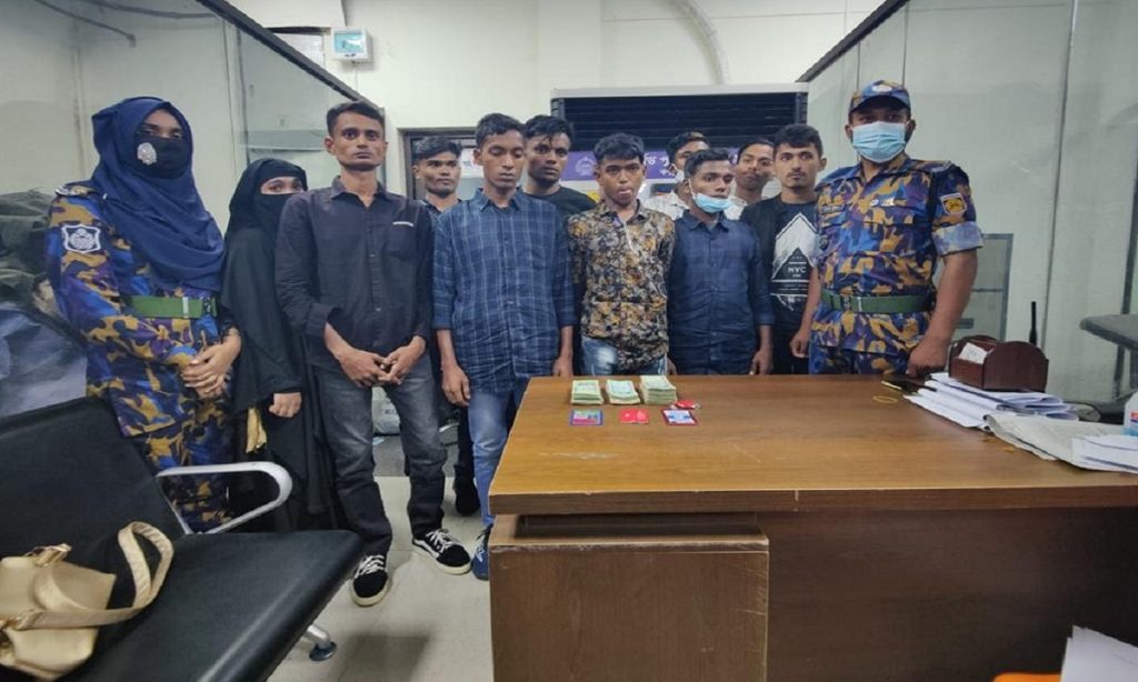 মঙ্গলবার (২৩ আগস্ট) বিকাল ৩টার দিকে বিমানবন্দর টার্মিনাল ভবনের কনকোর্স হল থেকে তাদের আটক করা হয়। আটককৃতরা হলেন- মো. নূর, মো. আয়াজ, আব্দুল হক, রবি আলম, মো. নূর, ওসমান, আবু বক্কর সিদ্দিক, রেজাউল করিম, মো. আজিজ, মো. ফয়সাল ও রহিমা।