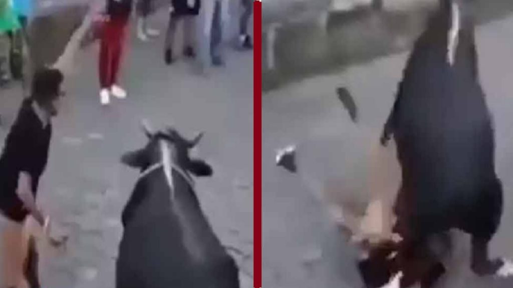 হঠাৎই ক্ষেপে যায় ষাঁড়টি। সামনে দাঁড়ানো লোকটিকে শিং দিয়ে মুখে গুঁতো মারতেই মাটিতে পড়ে যান তিনি। তার বুকে পা দিয়ে আঘাতও করতে দেখা যায় ষাঁড়টিকে। তারপরই সেটি ঘটনাস্থল থেকে পালিয়ে যায়। ষাঁড়ের এই কাণ্ড দেখে সামনে দাঁড়ানো লোকজন এদিক ওদিক ছিটকে যেতে শুরু করে।