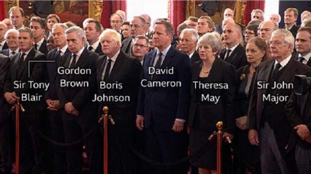 বিবিসির প্রতিবেদনে বলা হয়েছে, ঐতিহাসিক অনুষ্ঠানে সদ্য বিদায়ী প্রধানমন্ত্রী বরিস জনসনের পাশাপাশি থেরেসা মে, ডেভিড ক্যামেরুন, গর্ডন ব্রাউন, টনি ব্লেয়ার ও স্যার জন মেজরকে দেখা যায়। এ সময় নিজেদের মধ্যে আলাপ করতে দেখা যায় তাদের।