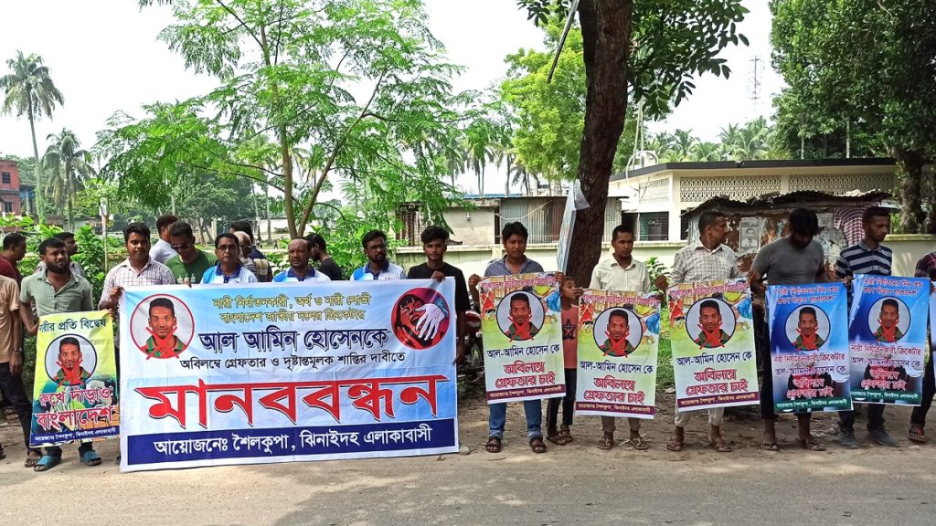 নারী নির্যাতনের অভিযোগে ক্রিকেটার আল আমিন হোসেনকে অবিলম্বে গ্রেফতার করে তার দৃষ্টান্তমূলক শাস্তি নিশ্চিতের দাবিতে মানববন্ধন করেছেন আলামিন হোসেনের স্ত্রী নুসরাত মিশুর স্বজন ও এলাকাবাসী। রোববার (১৮ সেপ্টেম্বর) সকাল ১১টায় শৈলকুপা উপজেলা পরিষদের সামনে এই মানববন্ধন আয়োজিত হয়।