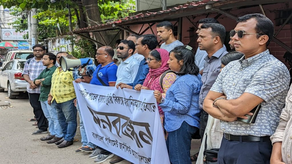 বৃহস্পতিবার (২২ সেপ্টেম্বর) ঢাকা রিপোর্টার্স ইউনিটি (ডিআরইউ) প্রাঙ্গণে এ মানববন্ধন পালিত হয়।