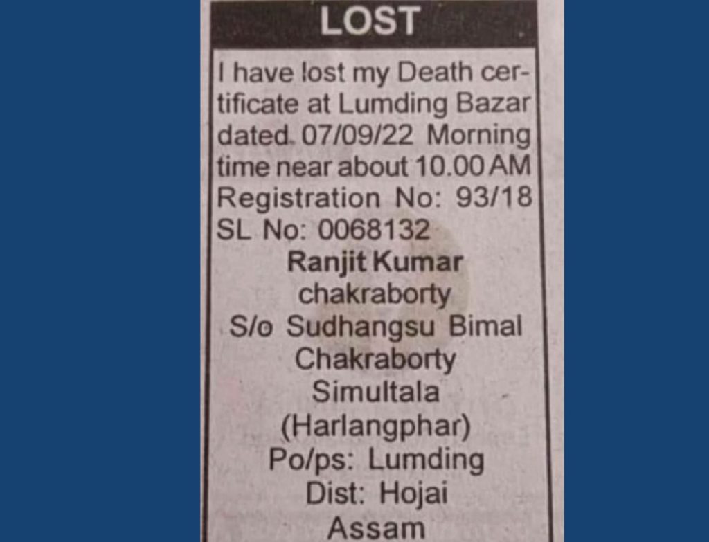বিজ্ঞাপনটি মূলত ভারতীয় একটি পত্রিকার। সেখানে একটি নিখোঁজ বিজ্ঞাপন দিয়ে বলা হয়, ত ০৭/০৯/২২ তারিখে লামডিং বাজারে আমার মৃত্যুর শংসাপত্র হারিয়ে ফেলেছি। সময় আন্দাজ সকাল ১০টা। রেজিস্ট্রেশন নম্বর:৯৩/১৮। এসএল নং: ০০৬৮১৩২।