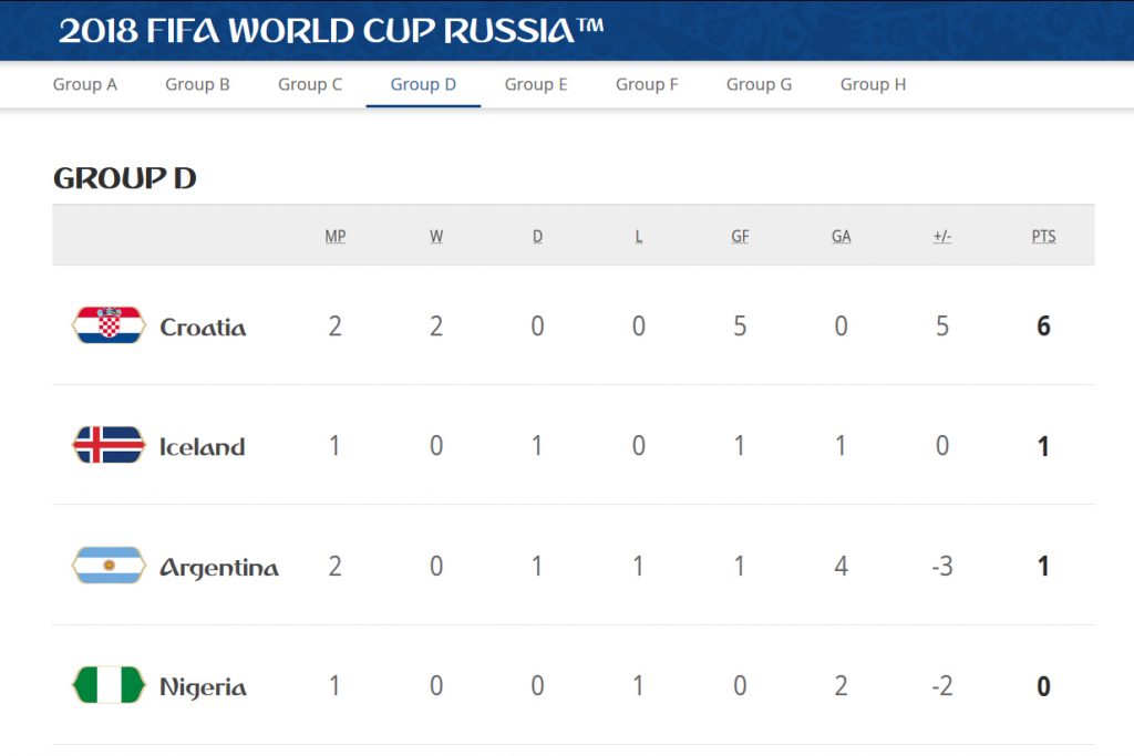 সবশেষে, যদি শুক্রবার আইসল্যান্ড-নাইজেরিয়া ম্যাচ ড্র হয়, তখন আইসল্যান্ডের পয়েন্ট হবে ২, আর্জেন্টিনা ও নাইজেরিয়া-দুদলেরই ১ পয়েন্ট করে। এমন অবস্থায়ও শুধু নাইজেরিয়াকে হারিয়ে স্বস্তিতে থাকতে পারবেনা আলবিসিলেস্তেরা। শেষ ম্যাচে ক্রোয়েশিয়াকে জিততেই হবে আইসল্যান্ডের বিরুদ্ধে।