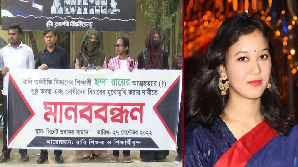 বিয়ের আড়াই মাস পার না হতেই পারিবারিক কলহের জেরে মারা গেছেন রাজশাহী বিশ্ববিদ্যালয়ের ছাত্রী ছন্দা রায়। সোমবার বিকেলে ঢাকার মুগদা থানার মানিক নগর এলাকার ভাড়া বাসায় ফ্যানের সাথে ঝুলন্ত অবস্থায় তার মরদেহ উদ্ধার করে পুলিশ। নিহতের স্বামীর দাবি, এটি আত্মহত্যা। তবে তার শিক্ষক ও সহপাঠীরা দাবি করেছেন এটি হত্যা।