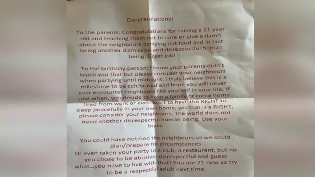 ওই চিঠিতে বার্থডে বয়কে বলা হয়, মধ্যরাত পর্যন্ত পার্টি করার পরিকল্পনা করার আগে প্রতিবেশীদের কথা বিবেচনা করা উচিত ছিল। আমি জানি আপনার বাবা-মা আপনাকে এটি শেখাননি তবে, অনুগ্রহ করে মধ্যরাত পর্যন্ত পার্টি করার সময় আপনার প্রতিবেশীদের কথা বিবেচনা করুন। আমি সত্যিই বিশ্বাস করি এটি উদযাপনের একটি মাইলফলক হয়ে থাকবে। আশা করি আপনি আপনার জীবনে কখনো নিজের মতো প্রতিবেশীদের মুখোমুখি হবেন না।