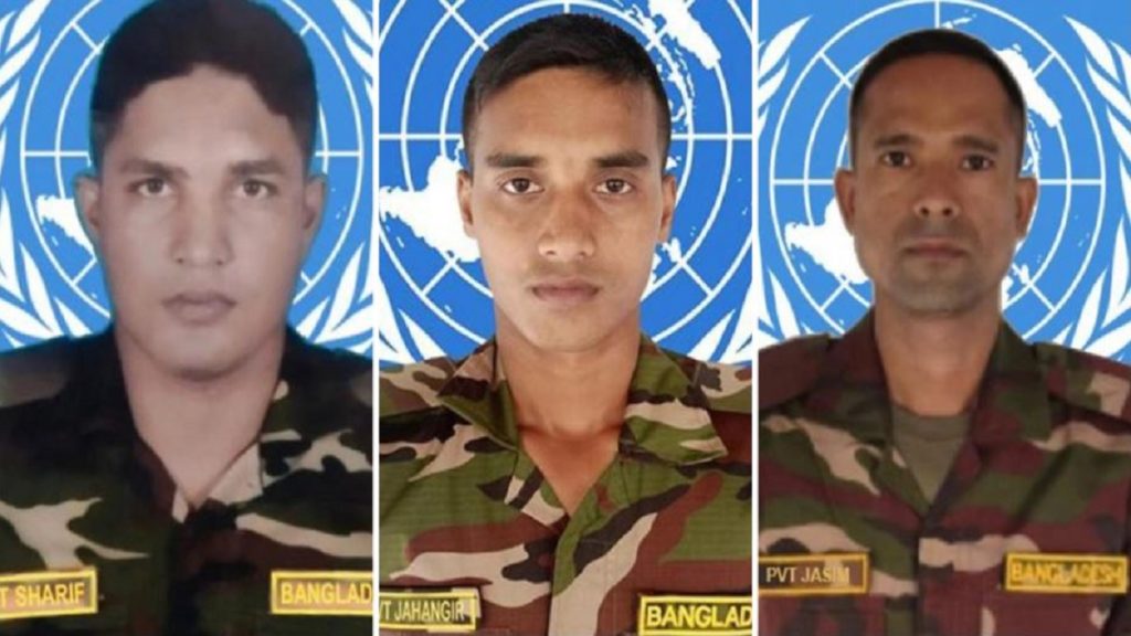 সেন্ট্রাল আফ্রিকান রিপাবলিকে জাতিসংঘ শান্তিরক্ষা মিশনের অপারেশন কার্যক্রম পরিচালনাকালে বাংলাদেশি ৩ শান্তিরক্ষী নিহত হয়েছেন। সোমবার স্থানীয় সময় রাত ৮টা ৩৫ মিনিটে (বাংলাদেশ সময় ৪ অক্টোবর ১টা ৩৫ মিনিট) বাংলাদেশি শান্তিরক্ষীদের একটি গাড়ি ইমপ্রোভাইজভ এক্সপ্লোসিভ ডিভাইস (আইইডি) বিস্ফোরণে পড়ে। তাতে তারা নিহত হন এবং একজন আহত হয়েছেন।
