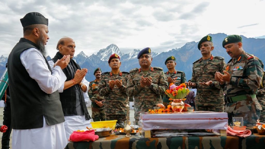 চীন সীমান্তবর্তী সামরিক ঘাঁটিতে শস্ত্র পূজা দিলেন ভারতের প্রতিরক্ষামন্ত্রী রাজনাথ সিং। মহাভারতে বর্ণিত পৌরাণিক চরিত্র অর্জুন তার অস্ত্রের পূজা করতেন। সেখান থেকেই শস্ত্র পূজার প্রচলন হয়েছে। বুধবার (৫ অক্টোবর) সনাতন ধর্মাবলম্বীদের উৎসব দশেরা উপলক্ষ্যে ছিল এ আয়োজন।