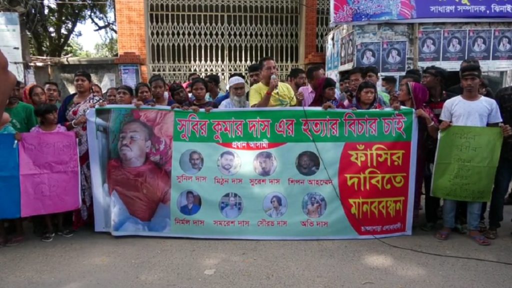 ঝিনাইদহে সেলুন ব্যবসায়ী সুবীর দাসকে হত্যার বিচার ও আসামিদের ফাঁসির দাবিতে ঝিনাইদহে মানববন্ধন কর্মসূচি পালিত হয়েছে। শুক্রবার (৭ অক্টোবর) সকালে শহরের পোস্ট অফিস মোড়ে এ কর্মসূচির আয়োজন করে নিহতের