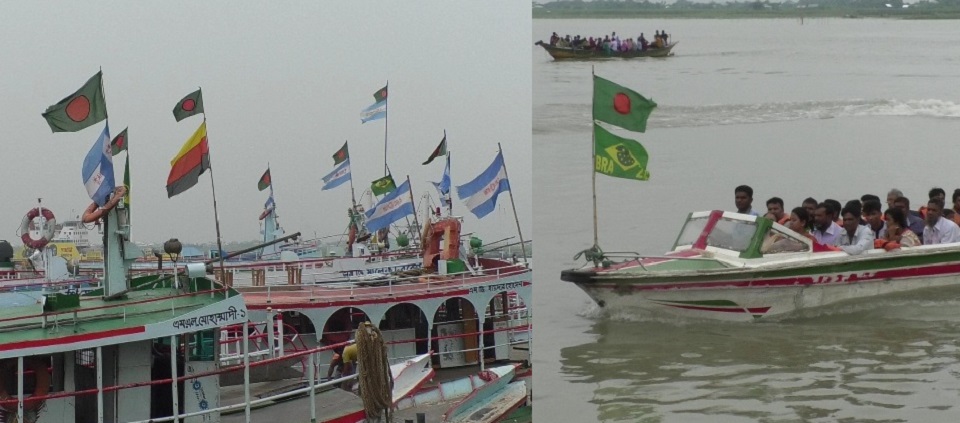 আর্জেন্টিনা, ব্রাজিলের পতাকার প্রাধান্য পেলেও রয়েছে অন্যান্য দলের পতাকাও। এক একটি নৌযানে একাধিক দলের পতাকাই প্রমাণ করে কতটা মুখিয়ে তারা খেলা নিয়ে। শুধু নৌযানই নয় পুরো ঘাট এলাকাই সাজানো হয়েছে মনোরম সাজে।