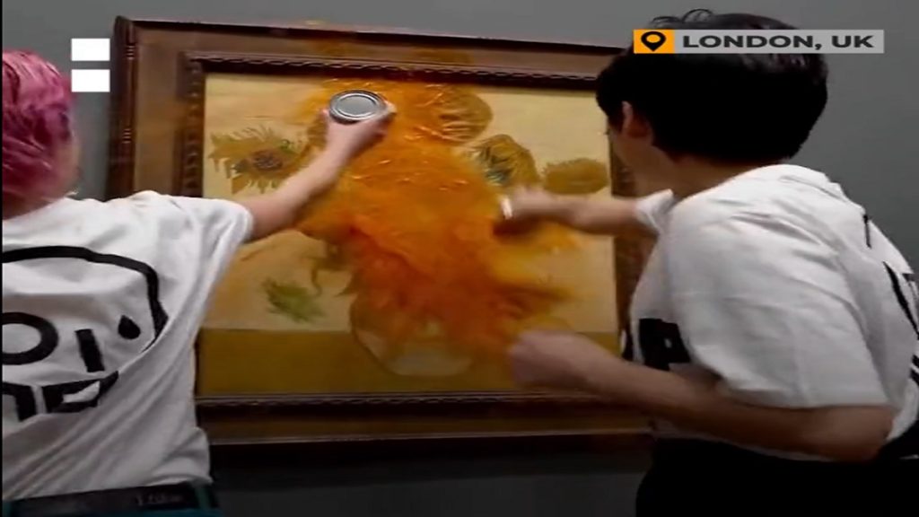 ভাইরাল হওয়া ভিডিওতে দেখা যায়, দুর্মূল্য এই শিল্পকর্মের ওপর ক্যানে করে টমেটো স্যুপ ছুড়ে মারেন ওই দুই পরিবেশ কর্মী। ওই ঘটনার পর তাদের গ্রেফতার করা হয়েছে। সম্পদ বিনষ্টের অভিযোগ আনা হয়েছে তাদের বিরুদ্ধে। জাস্ট স্টপ অয়েল নামে এই পরিবেশবাদী সংগঠনের কর্মী তারা। মূলত তেলের ব্যবহার বন্ধ করা নিয়ে প্রচারণা চালায় এই সংগঠন।