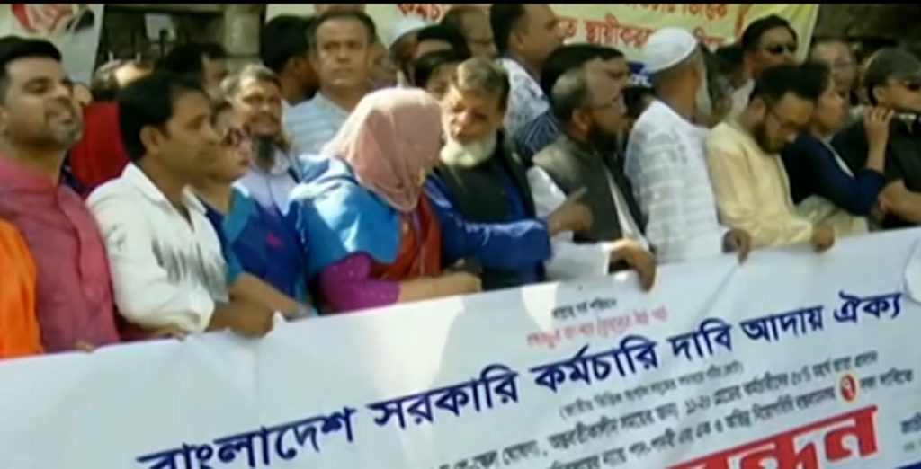 শনিবার (১৫ অক্টোবর) এ মানববন্ধন করা হয়েছে। মানববন্ধন কর্মসূচিতে অংশগ্রহণকারীরা বলেন, প্রজাতন্ত্রের কর্মচারীদের মধ্যে ৯ম গ্রেড পর্যন্ত কর্মকর্তারা সব ধরনের সুবিধা ভোগ করছেন। কিন্তু স্বাধীনতার এত বছর পরও ১১ থেকে ২০তম গ্রেডের কর্মচারীরা বৈষম্যের শিকার।