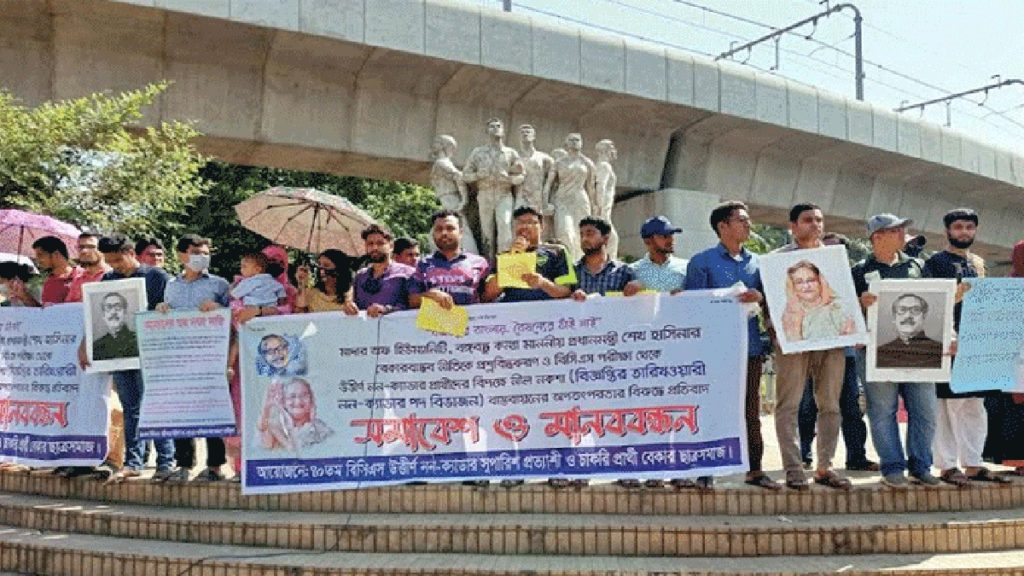 আগের নিয়মে বিসিএসে ননক্যাডার পদে চাকরিবিধি পুনর্বহাল করার দাবিতে মানববন্ধন করেছেন ৪০তম বিসিএসে উত্তীর্ণ চাকরি প্রার্থীরা।