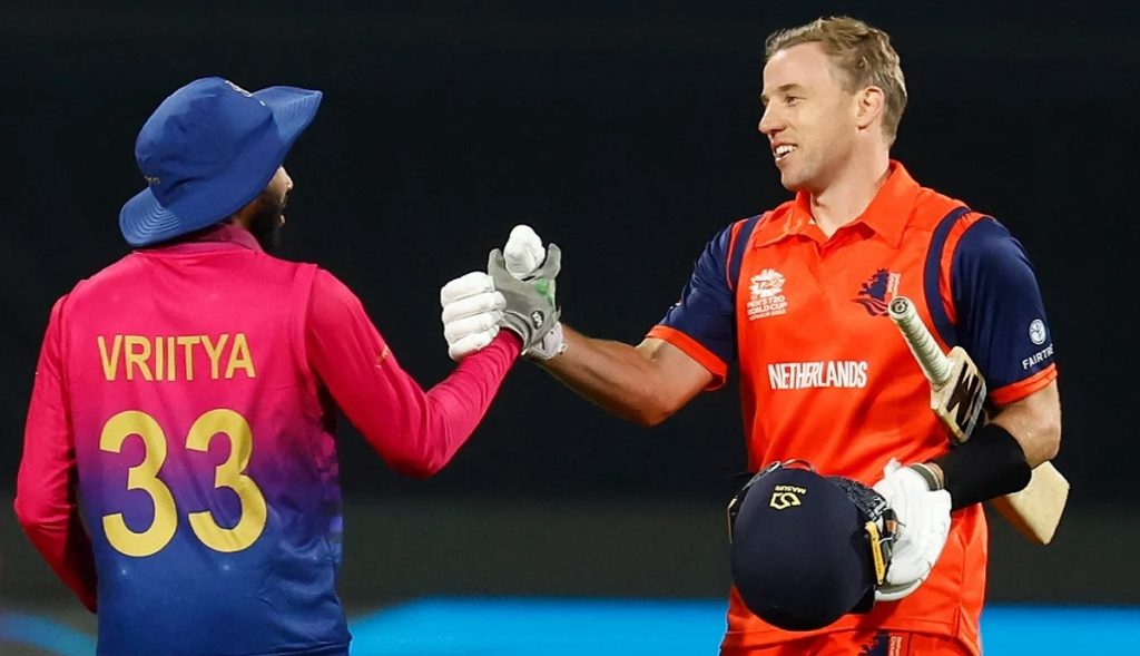 টি-টোয়েন্টি বিশ্বকাপের প্রথম রাউন্ডের ম্যাচে আরব আমিরাতের দেয়া ১১২ রানের লক্ষ্যে ব্যাট করতে নেমে মূলত জুনায়েদ সিদ্দিকের বোলিং তোপে পড়ে নেদারল্যান্ডস। ওপেনার ম্যাক্স ও’ডৌডের ১৮ বলে ২৩ রানই ইনিংসের সর্বোচ্চ। এছাড়া, কলিন একারম্যান, ব্যাস ডি লিডেরা ইনিংস বড় করতে না পারলে এক পর্যায়ে ৭৬ রানেই ৬ উইকেট হারিয়ে বসে ডাচরা। এরপর টিম প্রিঙ্গলকে নিয়ে ডাচ অধিনায়ক স্কট এডওয়ার্ডস যোগ করেন ২৭ রান। শেষ ৮ ওভারে নেদারল্যান্ডস পায়নি কোনো বাউন্ডারির দেখা। অনেকটা, সিঙ্গেলসের উপর ভর করেই ১ বল হাতে রেখে লক্ষ্যে পৌঁছায় নেদারল্যান্ডস।