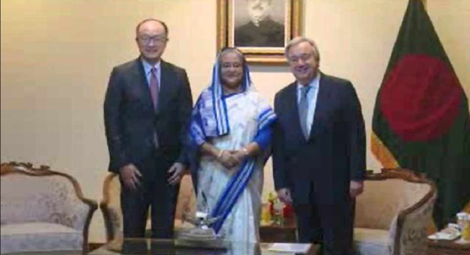 সকালে প্রধানমন্ত্রীর তেজগাও কার্যালয়ে সাক্ষাৎ করেন জাতিসংঘ মহাসচিব গুতেরেস। এসময় রোহিঙ্গাদের দ্রুত মিয়ানমারে ফেরাতে জাতিসংঘসহ আন্তর্জাতিক সম্প্রদায়কে আরো জোরালো ভুমিকা নেয়ার আহ্বান জানান প্রধানমন্ত্রী শেখ হাসিনা। বলেন, বাংলাদেশের পক্ষে এই বিপুল জনগোষ্ঠীকে দীর্ঘসময় রাখা কঠিন হয়ে দাঁড়াচ্ছে। এ সময় অন্যান্যের মধ্যে উপস্থিত ছিলেন পররাষ্ট্রমন্ত্রী এ এইচ মাহমুদ আলী, প্রতিমন্ত্রী শাহরিয়ার আলম। এছাড়া বিশ্বব্যাংকের প্রেসিডেন্ট জিম ইয়ং কিম ও ঢাকায় জাতিসংঘের আবাসিক সমন্বয়কারী।