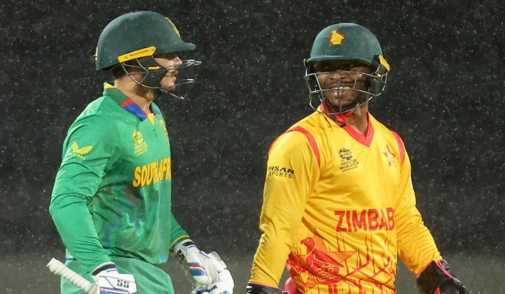 টি-টোয়েন্টি বিশ্বকাপে গ্রুপ টু’র বৃষ্টিবিঘ্নিত ম্যাচে দক্ষিণ আফ্রিকার সামনে ৯ ওভারে ৮০ রানের টার্গেট দেয় জিম্বাবুয়ে। এরপর আবারও বৃষ্টি শুরু হলে ৭ ওভারে ৬৪ রানের লক্ষ্য নির্ধারিত হয় প্রোটিয়াদের সামনে। কুইন্টন ডি ককের ১৮ বলে ৪৭ রানের ঝড়ো ব্যাটিংয়ে মাত্র ৩ ওভারেই ৫১ রান তুলে ফেলে দক্ষিণ আফ্রিকা। তবে এরপর আরও একবার মুষলধারে বৃষ্টি শুরু হলে খেলা বন্ধের ঘোষণা দেয়া হয়।