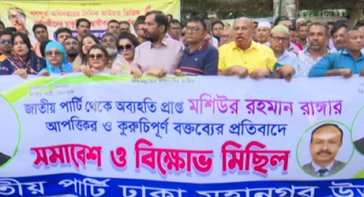 জাতীয় পার্টি থেকে অব্যাহতিপ্রাপ্ত মসিউর রহমান রাঙ্গার আপত্তিকর বক্তব্যের প্রতিবাদে সমাবেশ ও বিক্ষোভ মিছিল করেছে পার্টির ঢাকা মহানগর উত্তর অংশ।