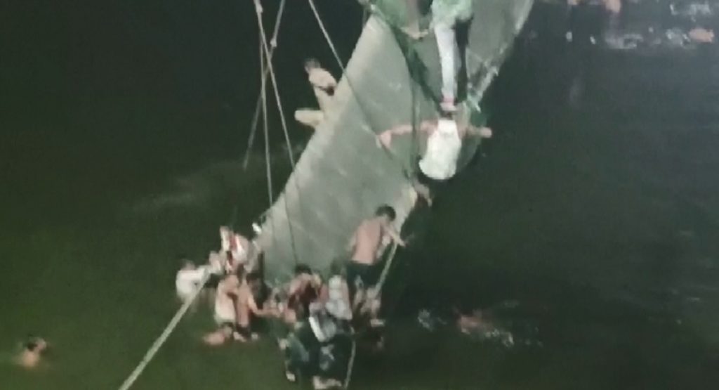রোববার (৩০ অক্টোবর) সন্ধ্যায় গুজরাটের মোরবি শহরের মাচ্চু নদীর ওপর নির্মিত শতবর্ষী ঝুলন্ত সেতুটি ভেঙে পড়ে। এ সময় সেতুতে থাকা কয়েকশ’ মানুষ নদীতে পড়ে যায়। অনেকে সেতুতেও ঝুলতে থাকে। পরে ৯১ জনের মরদেহ উদ্ধার করে পুলিশ। এখনও নিখোঁজ রয়েছেন শতাধিক মানুষ। এদের মধ্যে নারী ও শিশুও রয়েছে। তাদের উদ্ধারে চলছে অভিযান। নিহতের সংখ্যা আরও বাড়ার শঙ্কা কর্তৃপক্ষের।