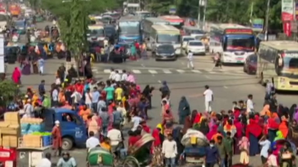 বেতন ও পাওনা না বুঝিয়ে দিয়ে হঠাৎ কারখানা বন্ধের প্রতিবাদে রাজধানীতে বিক্ষোভ করছে অলিও অ্যাপারেলস লিমিটেড গার্মেন্টসের শ্রমিকরা।