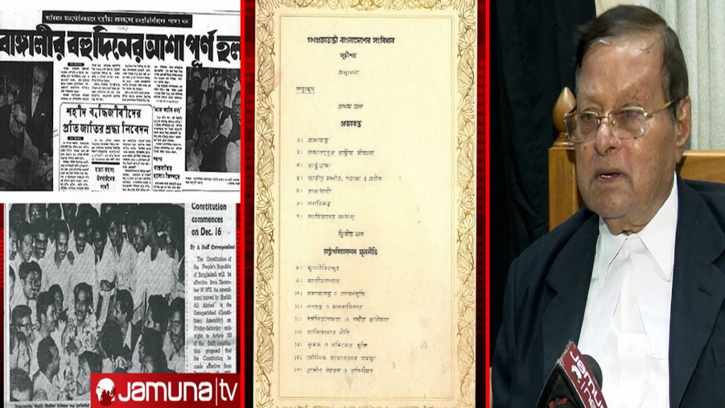 উনিশ’শ বাহাত্তর সালের চার নভেম্বর গণপরিষদে সংবিধান বিল গৃহীত হয়। সংবিধান কার্যকর হয়েছিল ১৬ই ডিসেম্বর। এর মধ্য দিয়ে দ্রুততম সংবিধান প্রণয়নের নজির তৈরি করেছিল বাংলাদেশ। তবে, বার বার সংশোধনী আনার কারণে বদলে দেয়া হয় মৌলিক চেতনাও। রাষ্ট্রধর্ম, সংসদ সদস্যদের নিজ দলের বিরুদ্ধে ভোট দেয়ার সুযোগ না রাখা আর নির্বাচনকালীন সরকার ব্যবস্থা বাতিল নিয়ে বিতর্ক আছে।