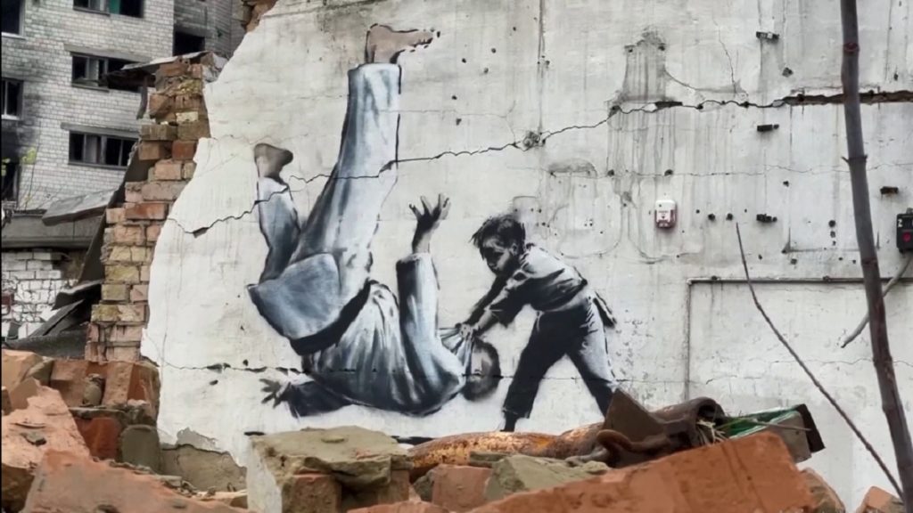 ইউক্রেনের বোরোদিয়াঙ্কা শহরে রুশ হামলায় বিধ্বস্ত ভবনের দেয়ালে শোভা পাচ্ছে ব্যাঙ্কসির গ্রাফিতি। নিজের ইনস্টাগ্রাম আইডিতে সেই গ্রাফিতির ছবিও প্রকাশ করেন এই শিল্পী।