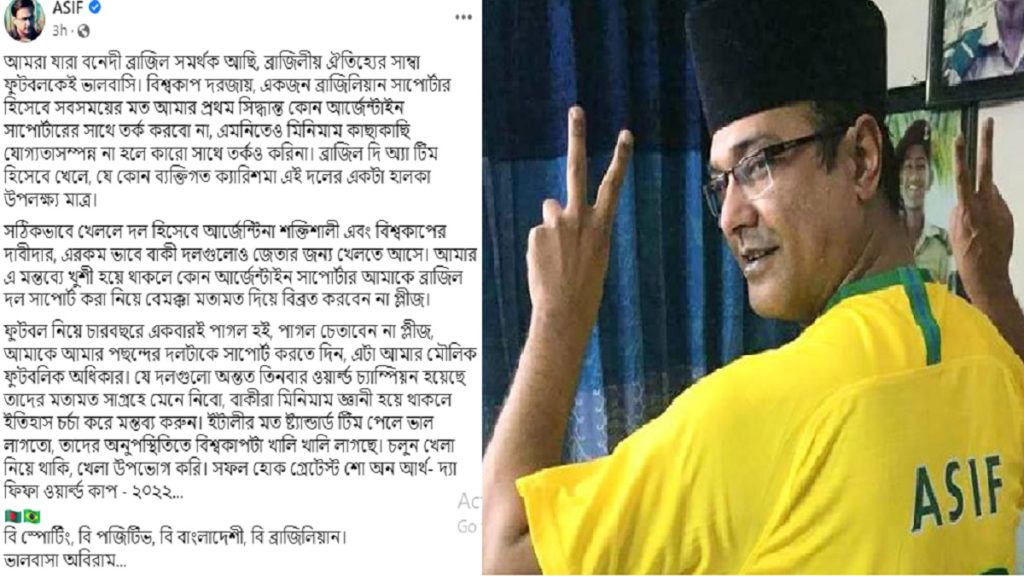 তেমনি বাংলাদেশের জনপ্রিয় সঙ্গীত শিল্পী আসিফ আকবর একজন পাঁড় ব্রাজিল সমর্থক। তা জানান দিয়েছেন নিজের ফেসবুক ওয়ালে। অহেতুক ফুটবলীয় তর্কে না জড়াতে প্রতিপক্ষ সমর্থকদের মধুর হুমকিও দিয়েছেন এই তারকা।
