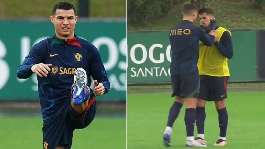 সবকিছু ঝেড়ে ফেলে পর্তুগাল দলে যোগ দেন রোনালদো, কিন্তু সেখানেও যেন একই রূপে তিনি। এক ভিডিওতে দেখা যায় কানসালো মুখ ভার করে মাঠের একপাশে মূর্তির মতো দাঁড়িয়ে আছেন। রোনালদো তার দিকে আস্তে আস্তে হেঁটে গিয়ে ঘাড়ের মধ্যে জোড়ে আঘাত করেন। তাতে ক্ষিপ্ত হন কানসালো। রাগে কয়েকবার ঘাড় ঝাড়া দেন তিনি। এরপর রোনালদো তাকে দুই হাত দিয়ে ধরেন। কিন্তু কানসালে এক প্রকার জোর করেই রোনালদোর হাত ছাড়িয়ে নেন।