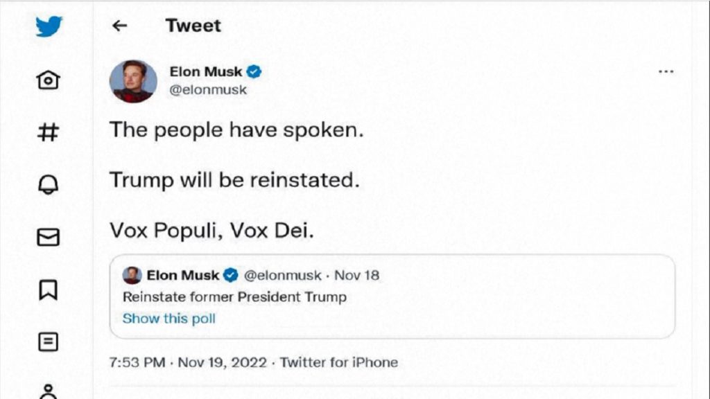টুইটারের দায়িত্ব নিয়েই এলন মাস্ক ঘোষণা দিয়েছিলেন, ফিরিয়ে দেয়া হবে ট্রাম্পের অ্যাকাউন্ট। শুক্রবার এক জরিপের আয়োজন করেন তিনি। ২৪ ঘণ্টায় ১ কোটি ৩০ লাখ মানুষ ভোট দেন। ট্রাম্পের অ্যাকাউন্ট ফিরিয়ে দেয়ার পক্ষে রায় দেন ৫১ দশমিক ৮ ভাগ ব্যবহারকারী। ফলাফল জানিয়ে টুইট করেন এলন মাস্ক। বলেন, জনগণের রায়ে টুইটারে ফিরছেন ট্রাম্প। জনগণের কণ্ঠই-ঈশ্বরের কণ্ঠ, ব্যবহার করেন এই লাতিন প্রবাদ।