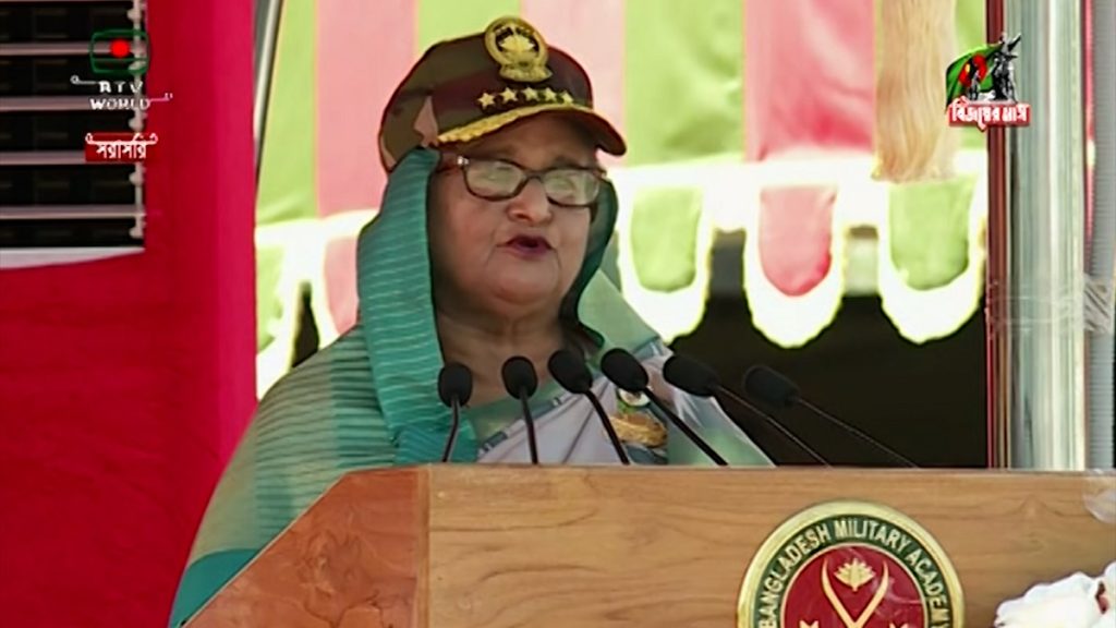 রোববার (৪ ডিসেম্বর) সকালে চট্টগ্রামে বাংলাদেশ মিলিটারি একাডেমির ৮৩ তম বিএমএ কোর্সের সমাপনী কুচকাওয়াজ অনুষ্ঠানে এ আহ্বান জানান প্রধানমন্ত্রী। বলেন, দেশপ্রেমে উদ্বুদ্ধ হয়ে দেশের প্রতি দায়িত্ব পালন করতে হবে সবাইকে। আমরা কোনো যুদ্ধ চাই না, শান্তি চাই। আর সবার সঙ্গে বন্ধুত্ব, কারও সাথে বৈরীতা নয়; এই নীতি নিয়ে কাজ করছে সরকার। ২০৪১ সালের মধ্যে বাংলাদেশকে উন্নত দেশ হিসেবে গড়ে তোলা হবে।