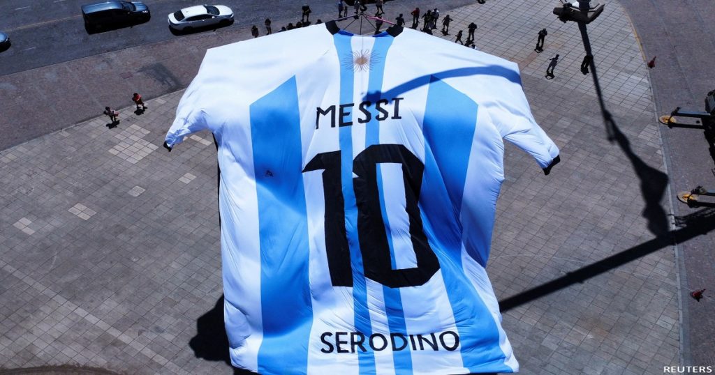 আর্জেন্টিনার সারোডিনো শহরে উড়ানো হয়েছে ১৮ মিটার উচ্চতার লিওনেল মেসির একটি জার্সি। এছাড়া বুয়েন্স আয়ার্সের ৩০০ কিলোমিটার উত্তরে তৈরি হয়েছে এলএমটেনের বেশ কিছু ম্যুরালও। মূলত শুভকামনা জানাতেই এমন কাণ্ড শহরবাসীর। তাদের বিশ্বাস, মেসির হাত ধরেই কাটবে ৩৬ বছরের বিশ্বকাপ না পাওয়ার আক্ষেপ।