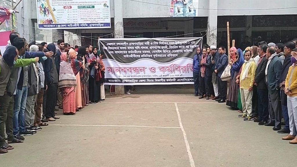এদিকে গত রোববার (১ জানুয়ারি) থেকে আইনজীবী ও ব্রাহ্মণবাড়িয়া বার অ্যাসোসিয়েশনকে নিয়ে আপত্তিকর মন্তব্য করার অভিযোগ তুলে নারী ও শিশু নির্যাতন দমন ট্রাইব্যুনাল-১ এর বিচারক (জেলা জজ) মোহাম্মদ ফারুকের আদালতে যাওয়া বন্ধ করেন আইনজীবীরা। পাশাপাশি ওই বিচারকের প্রত্যাহারও দাবি করে আইনজীবী সমিতি।