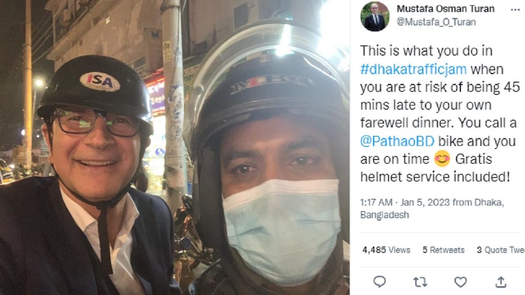 বাংলাদেশে নিযুক্ত তুর্কি রাষ্ট্রদূত মুস্তাফা ওসমান তুরান। যাচ্ছিলেন ঢাকায় একটি বিদায়ী নৈশভোজে যোগ দিতে। কিন্তু পথে নেমে দেখলেন তীব্র যানজট। তাই গাড়ি রেখে পাঠাও সার্ভিসের বাইকে চেপেই ছুটলেন দাওয়াতে।