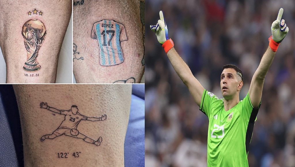 লুসাইল আইকনিক স্টেডিয়ামে আর্জেন্টিনা বনাম ফ্রান্সের মধ্যকার ফাইনালকে বিবেচনা করা হচ্ছে বিশ্বকাপ ইতিহাসেরই সেরা ফাইনাল হিসেবে। ম্যাচের অতিরিক্ত ৩০ মিনিটেরও তখন অন্তিম সময়। ফরাসি স্ট্রাইকার কোলো মুয়ানির সামনে কেবল আর্জেন্টাইন গোলরক্ষক এমিলিয়ানো মার্টিনেজ। কিন্তু কোলো মুয়ানির সামনে সেই একটি বাধাই হয়ে দাঁড়ালো পাহাড়সম। অবিশ্বাস এক সেভে ম্যাচকে টাইব্রেকারে নিয়ে যান এমি; যেখানে আরেক প্রস্থ বীরত্ব দেখিয়ে আর্জেন্টিনাকে ৩৬ বছর পর বিশ্বকাপের স্বাদ পেতে মুখ্য ভূমিকা পালন করেন তিনি। ট্যাটুতে সেই সেভের সময়টিও উল্লেখ আছে, ১২২ মিনিট ৪৩ সেকেন্ড। অতিরিক্ত ৩ মিনিটের হিসেবে সেটাই ছিল ম্যাচের শেষ দিককার শট।